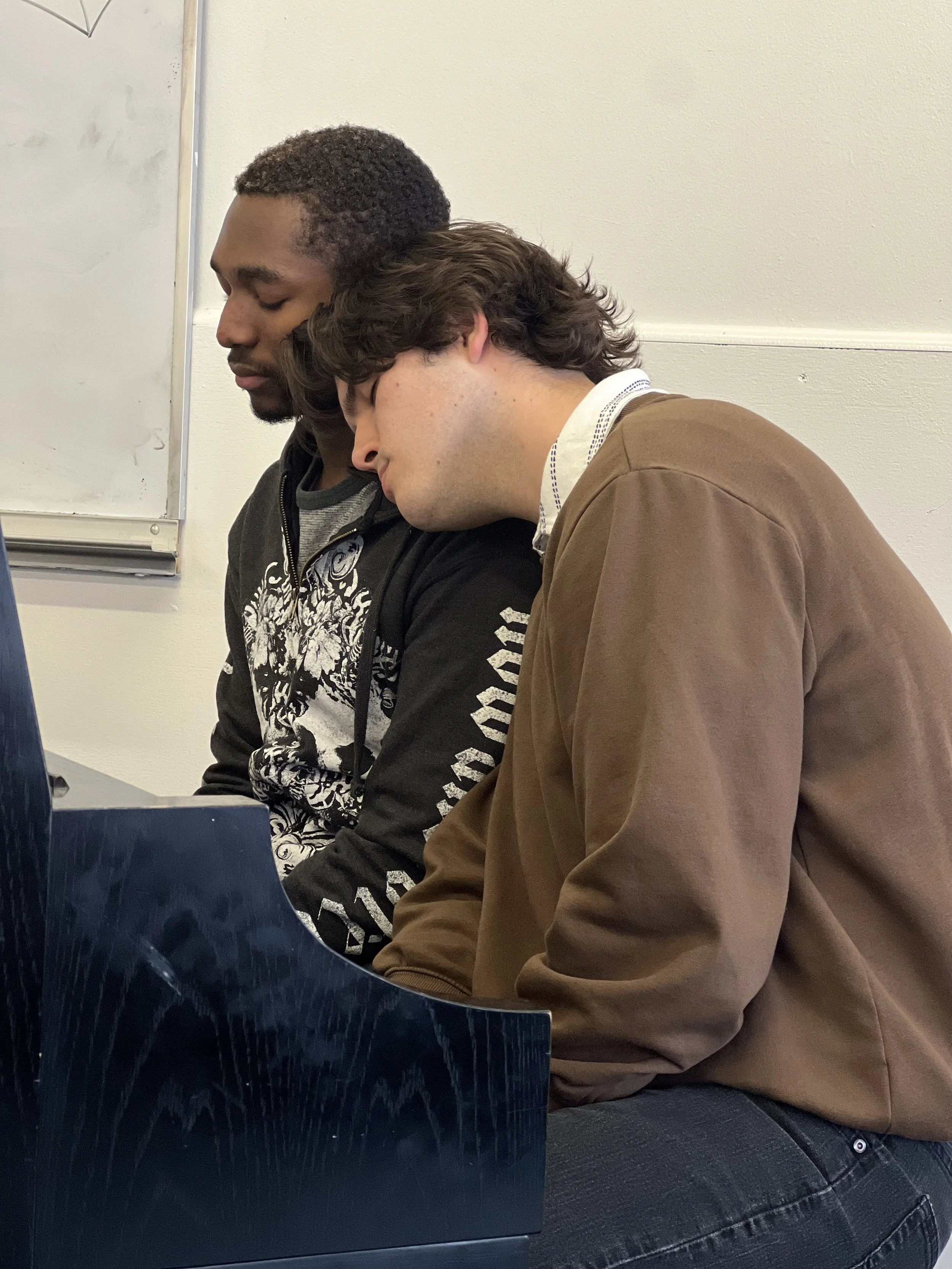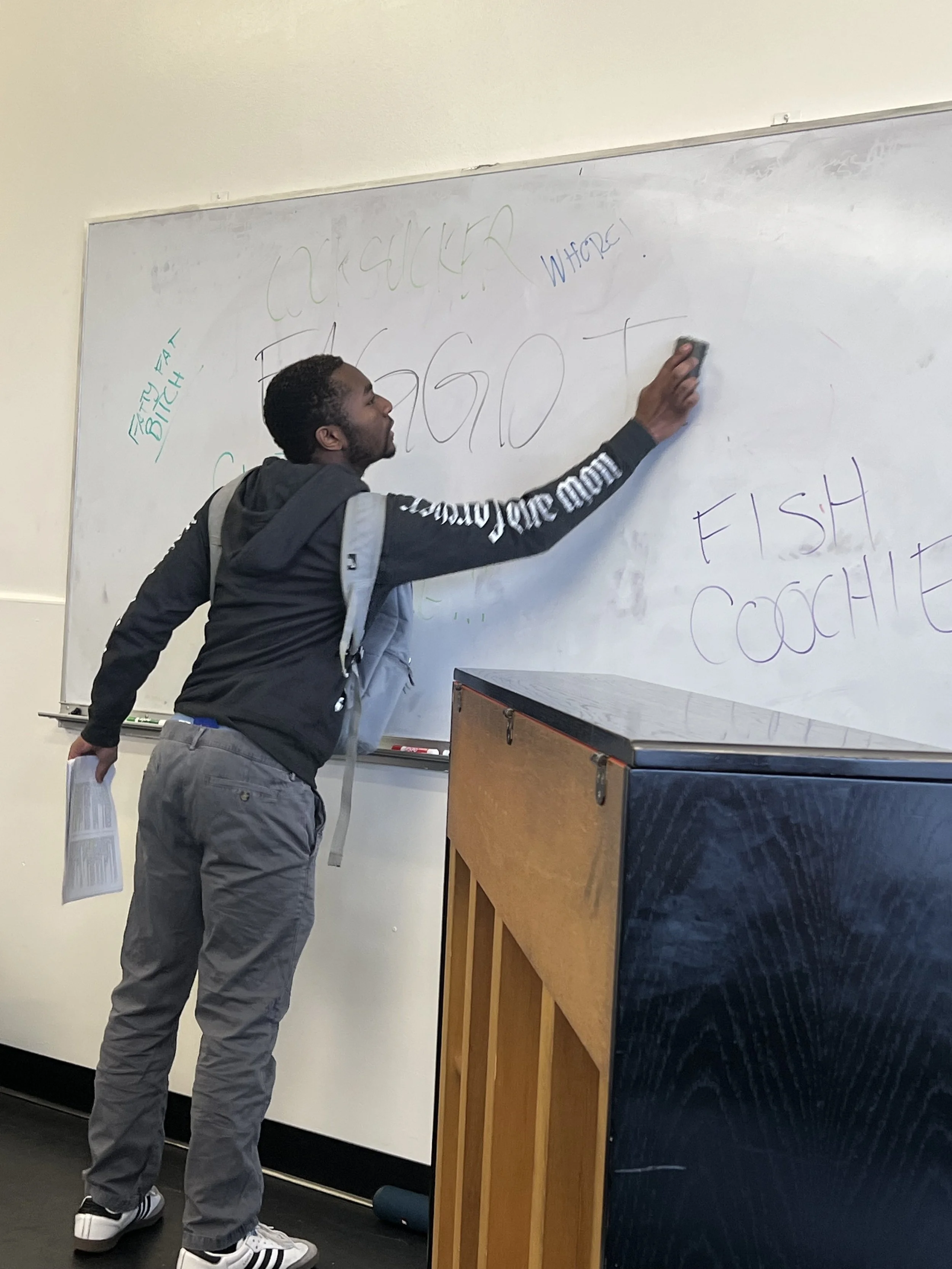 From a staging perspective, I decided to experiment with a tennis-court style staging, with audience on two sides of the performance space, emulating a school hallway. I also used a central whiteboard: in the opening moments, the characters entered dancing to the famous Charlie Brown theme song; then, they gradually started fading away to write insults on the whiteboard, escalating to Matt writing “F*GGOT” as Beethoven entered.